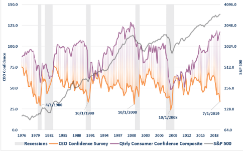面临的潜在挑战 贸易因素是今年美联储议息会议频繁提及的关键点,也是美国经济目前面临的威胁之一。美国谘商会调研发现,与消费者信心相比,企业高管对经济的信心指数处于近年来的低位。如今下滑的商业投资逐渐成为经济的薄弱环节。美国经济分析局数据显示,美国企业利润第三季度同比下降0.8%,贸易形势、劳动力成本上升、全球经济放缓等因素拖累美国企业扩张业务的步伐,反映软件、研发、设备等业务支出的非住宅固定投资下降2.7%。 摩根大通区域投行业务主管里希特(John Richert)表示,出于对企业未来盈利前景不确定性的担忧,与他交流的大多数企业领导人都在考虑控制2020年的资本支出,并为潜在风险对业务产生影响进行准备。从行业分布分析,制造商、运输和消费零售企业面临的运营压力较大。里希特透露,中小企业CEO们正在越来越多地研究所谓的“平等合并”,以扩大规模并帮助企业度过未来的低迷时期。 历史上看,企业家与消费者的立场分歧往往蕴含风险,因为这种情况通常发生在经济衰退开始之前。出于职业的敏感性,企业CEO的信心指数变化领先于消费者,而当经济形势最终明显恶化时消费者的反应则表现出“激烈而迅速”。道富全球首席市场策略师阿隆(Michael Arone)指出,积极的消费者信心和消极的商业信心之间的差距令人担忧。市场不会同时出现繁荣和衰退,最终大家的观点将逐步趋向于一致。 施瓦茨告诉第一财经记者,考虑到特朗普在贸易政策上的摇摆不定,企业商业投资情绪短时间内很难得到改善。但随着大选临近,他预计美国政府的贸易政策预期将逐步转向温和,这对于企业投资而言是中性偏利好的消息。