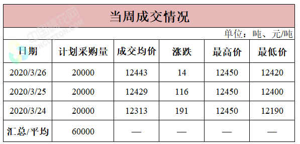 截至3月26日,累计成交均价13225元/吨,成交最高价14197元/吨,成交最低价12071元/吨。