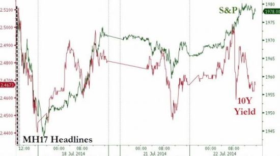 周二,普京称将配合调查马航MH17事件,市场对地缘政治风险担心减退,此外美国企业财报向好、成屋销售数据超预期,全球股市普涨,标普500创新 高,VIX盘中跌8.7%。黄金跌0.6%。欧元兑美元(1.3466, 0.0000, 0.00%)跌0.4%。