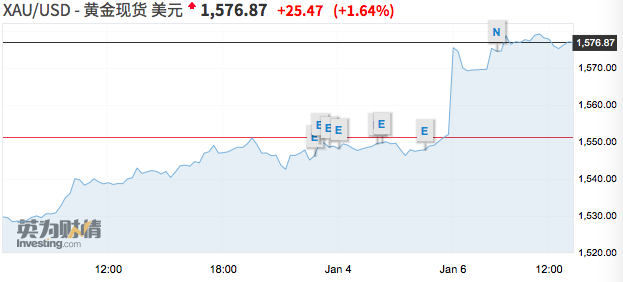 NO.2 伊朗正式宣布退出伊核协议 资本市场震荡 据伊朗法尔斯通讯社报道,当地时间1月6日晚,伊朗政府在一份声明中表示,在第五阶段,伊朗取消了所有伊核协议对其限制措施。伊朗迈出了第五阶段也是最后一步。 自1月3日美伊冲突不断升级以来,1月6日最新消息显示,伊朗政府宣布退出伊核协议,令全球市场哗然。在资本市场普遍下跌的情况下,黄金、石油以及石油相关板块一路走高, 表现十分亮眼。 1月6日,国际现货黄金盘中一度触及1583.7美元/盎司,涨幅超过2%。1月3日美伊冲突发生当天,黄金快速上涨约1.8%,一举站上1550美元关口,随后不断走高。此前机构纷纷预测,在2020年底前,黄金有望达到1600美元/盎司的水平。