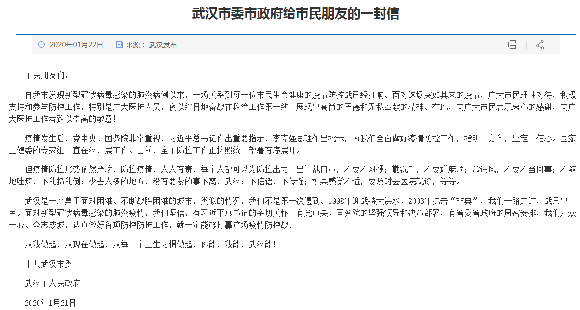 1月22日,武汉首次披露肺炎疫情后第23天,湖北省、武汉市两级政府自21日起集中发布关于疫情防护工作动态,特别是在习近平主席做出指示、李克强总理于针对疫情召开国务院常务会议后。 1月23日清晨,武汉新型冠状病毒感染的肺炎疫情防控指挥部发布1号通告,自23日10时起,武汉停运全城公交、地铁、轮渡、长途客车,市民无特殊原因不离开武汉,机场、火车站离汉通道暂时关闭。 于是,1月22日,成为启动上述措施之前的最后一天。 记者从多个渠道了解到,湖北省、武汉市两级政府近两天以来的相关指示已迅速传递到乡村单位级政府系统。另外,全国多个单位已针对疫情向单位员工发布防护工作指导。武汉地铁集团已于22日晚间7点40分通过官方微信平台披露,自23日起武汉地铁启动进站体温检测。 1月22日,武汉市政府通过官网向市民发布公开信: