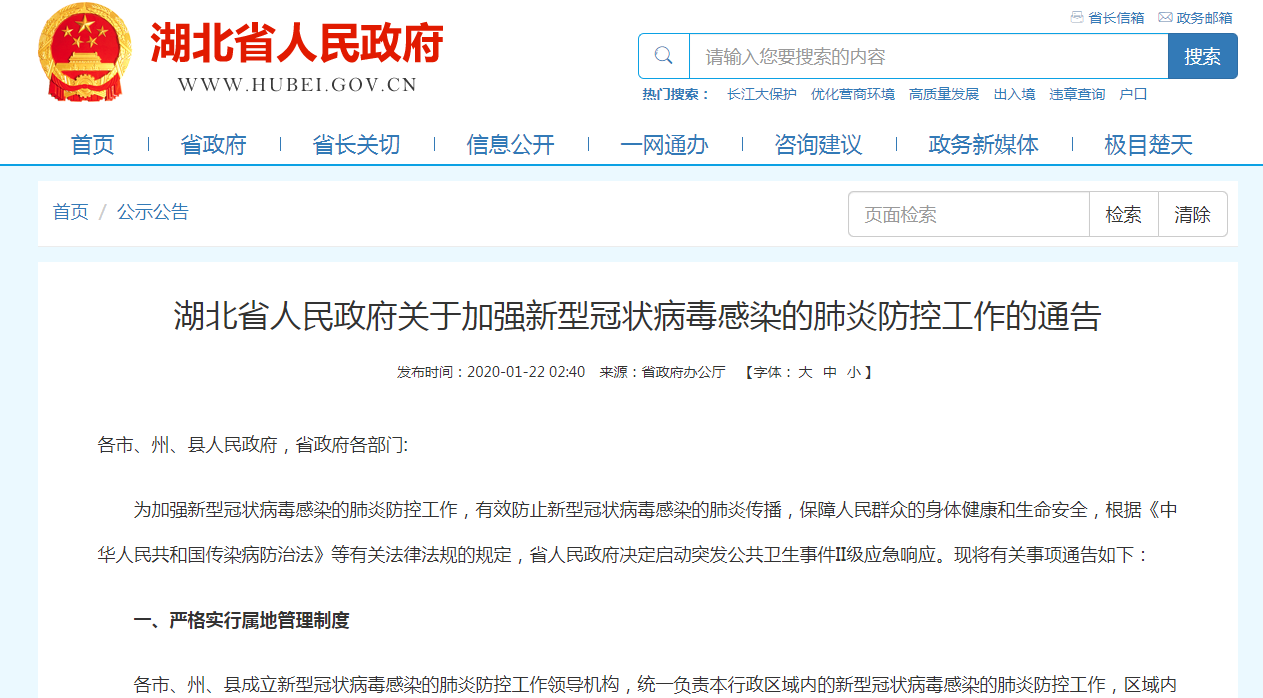 通过公开信,武汉市政府向市民提示防控措施:出门戴口罩,不要不习惯;勤洗手,不要嫌麻烦;常通风,不要不当回事;不随地吐痰,不乱扔乱倒;少去人多的地方,没有要紧的事不离开武汉;不信谣,不传谣;如果感觉不适,要及时去医院就诊等。 与此同时,湖北省政府于1月22日凌晨宣布启动公共卫生Ⅱ级应急响应,并发布相关通告: