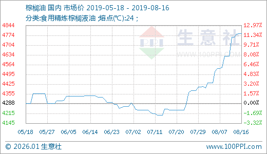 据生意社监测:8月以来,消息面上中美贸易关系升级,关税政策再出,外盘天气干旱,棕榈油主产国产量增速放缓,利多支撑,双粕油脂行情一路上涨,截止8月13日,豆粕市场均价3013元/吨,价格上涨7.24%;菜籽粕市场均价2456元/吨,价格上涨3.37%。豆油市场均价6000元/吨,价格上涨11.73%;棕榈油市场均价4762元/吨,价格上涨8.28%。