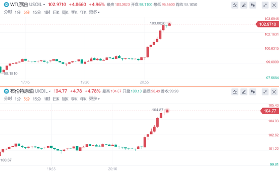 本周油价波动剧烈。 周四美盘,美布两油持续上拉,WTI原油日内大涨5.00%,报103.02美元/桶;布伦特原油站上104美元/桶,日内涨4.12%。原油系期货主力合约持续上涨,SC原油涨超4%,燃料油涨超3%,液化石油气(LPG)涨超1%。
